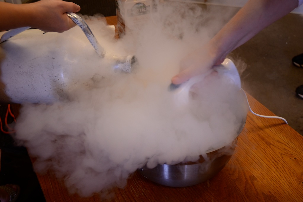 So why liquid nitrogen? Jenn, as mentioned, is a scientist and has previously studied and written a paper on the “Preparation Method and Temperature Influence on the Nucleation and Growth of Ice Crystals in Model Systems”, cowritten by Jennifer Gagner, Delia Bearup, and Katelyn Parker. The idea of the experiment was to explore the crystal evolution of ice cream using various freezing methods. Stewarts® and Dippin’ Dots© were compared to the homemade liquid nitrogen ice cream. The freezing method (slow and steady vs. quick and extremely cold) has an effect on the final product. Liquid Nitrogen ice cream is more similar to Dippin’ Dots©.