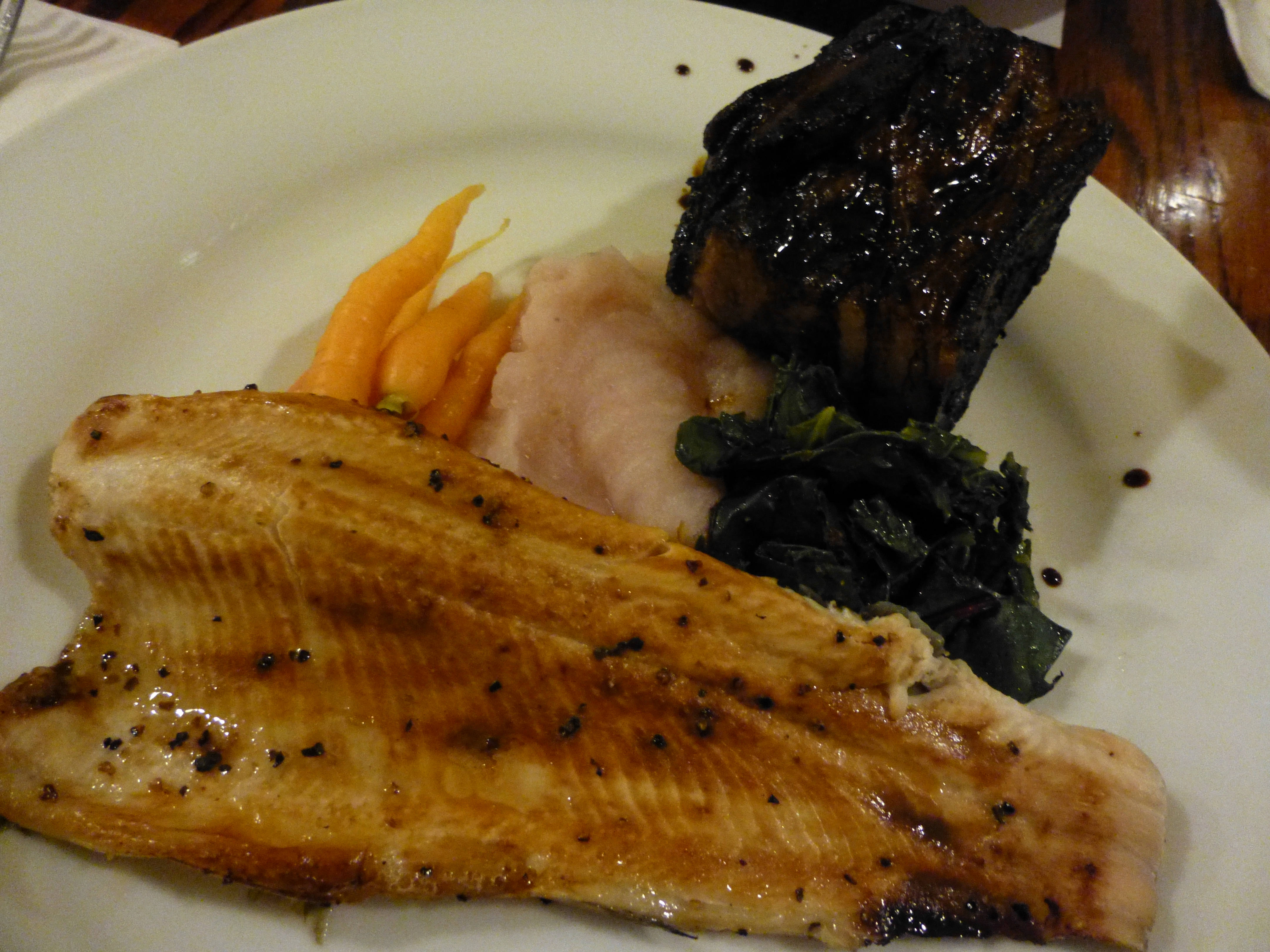 Smoked trout, braised short rib, pickled carrots, radish puree and greens.