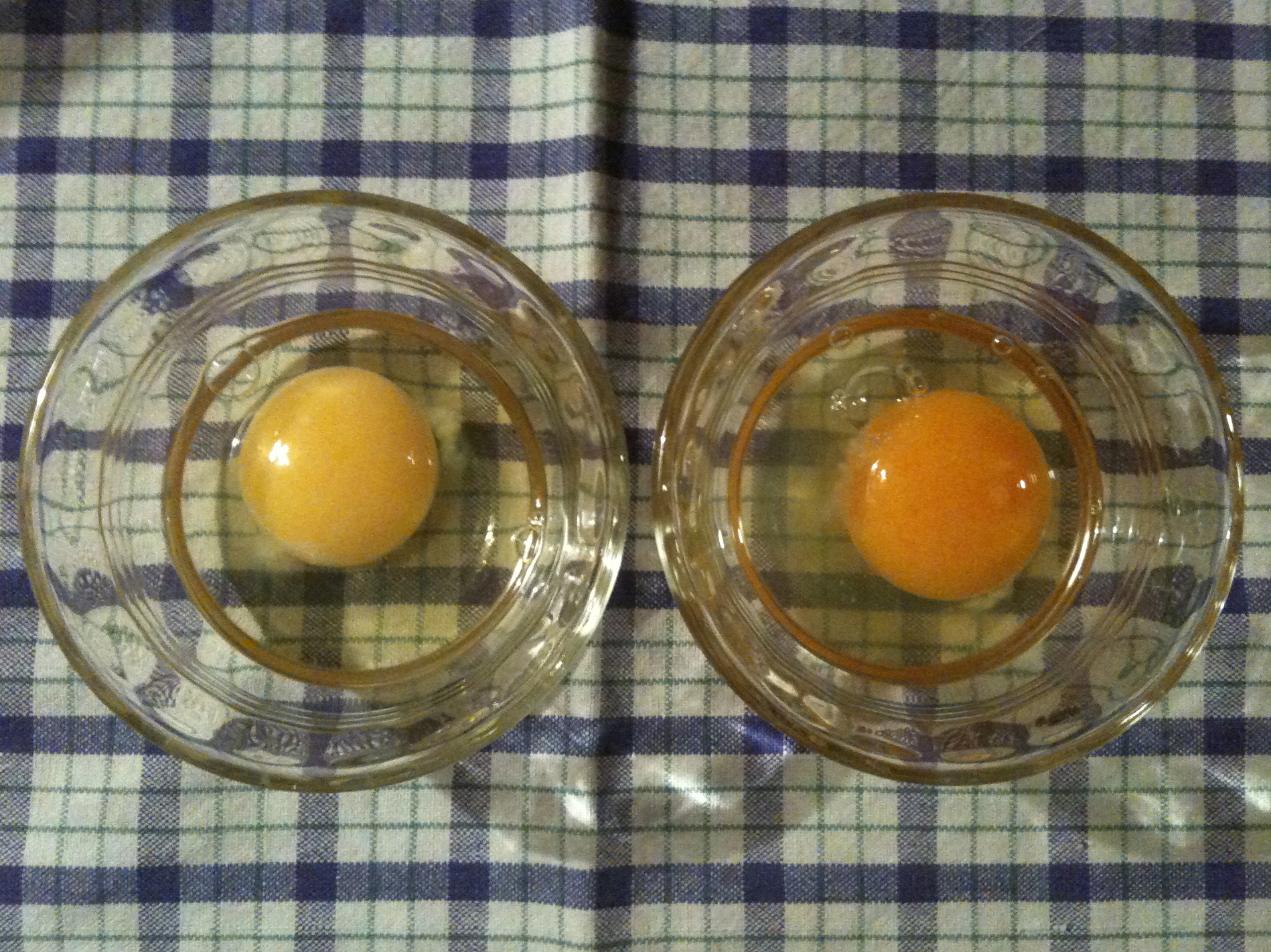 I picked two eggs of equal weight, down to the gram, and cracked them into small bowls to inspect their contents. Here the HWFC egg had the distinct advantage in terms of yolk size and color.