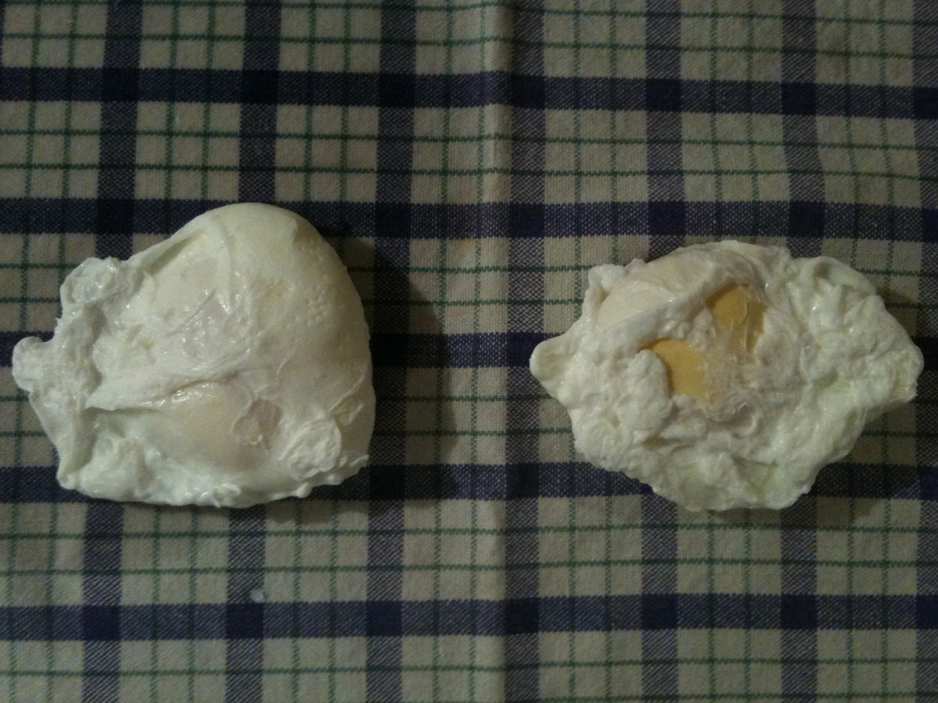 But then they went into acidulated the boiling water and my hypothesis that the Stewart’s egg would perform better was proved to be true. This very young egg had whites that clung to the yolk and protected the nucleus of the cell from the hot hot water. The egg from Bluebird Hill (of unknown age) didn’t quite come together.