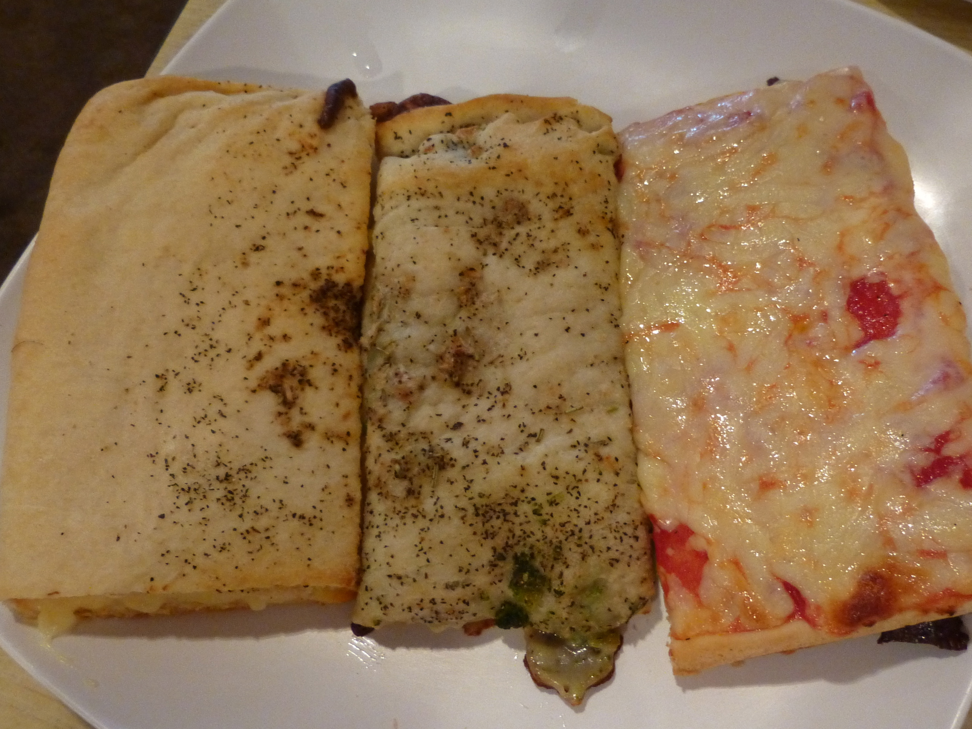 Anyhow, these were the most disappointing cuts on our tour. The white was bland, seasoned with just black pepper, and the cheese blend had almost a slimy character about it. The bottom crust of the red had some nice crunch to it, but was sandy in texture. Of all the cuts, the broccoli was the best of the bunch, because at least it had a bit more seasoning and flavor. But the broccoli itself was mushy, so even that was no great shakes.