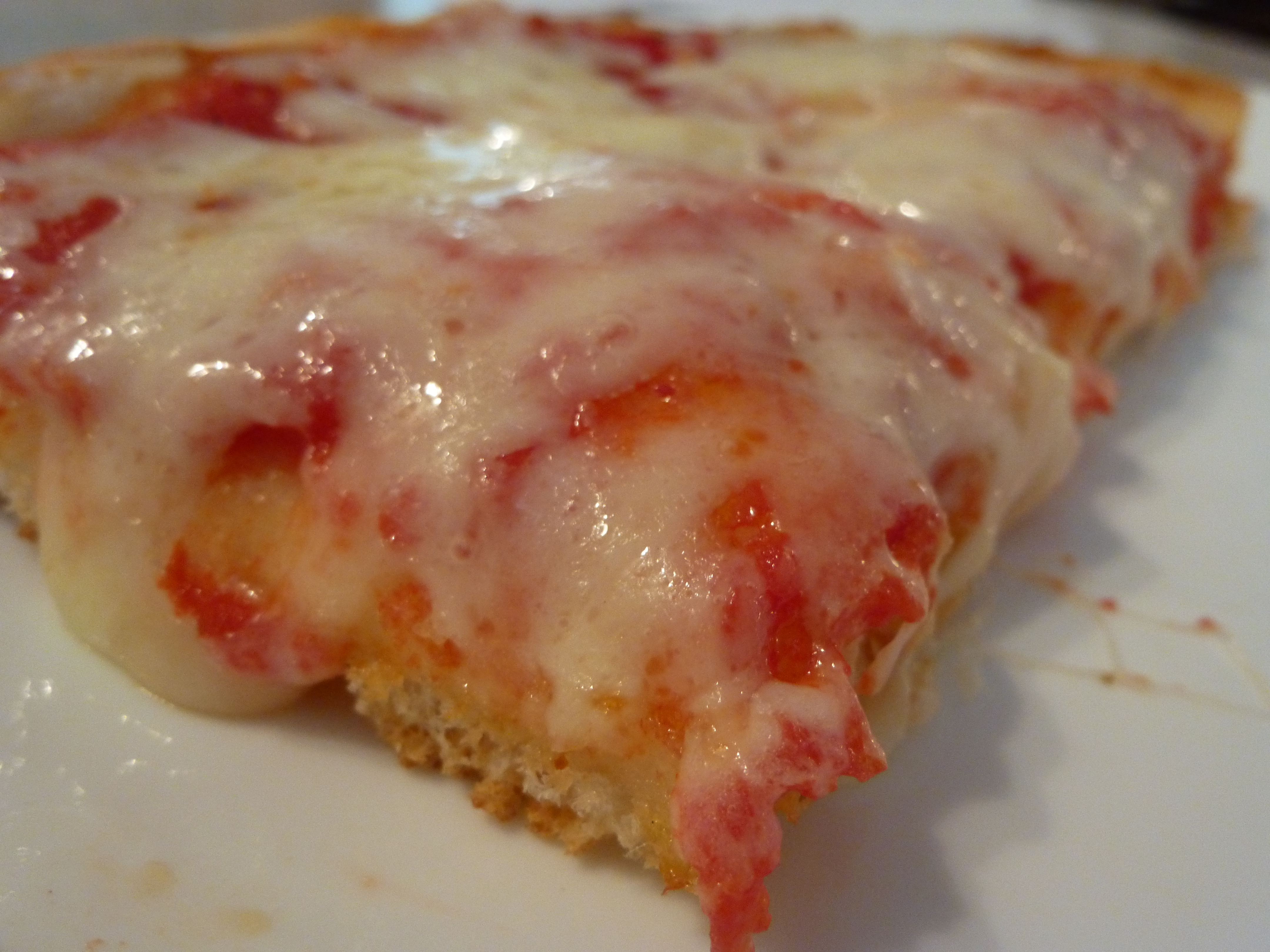The red has a baked, doughy crust, covered with a chunky, onion laced tomato sauce, and topped with a melty cheese blend that is said to stick to the roof of your mouth. And it does. This is a blend that includes processed cheese, so its meltability is high. It is almost runny when hot, but it congeals into a thick mass as it cools.