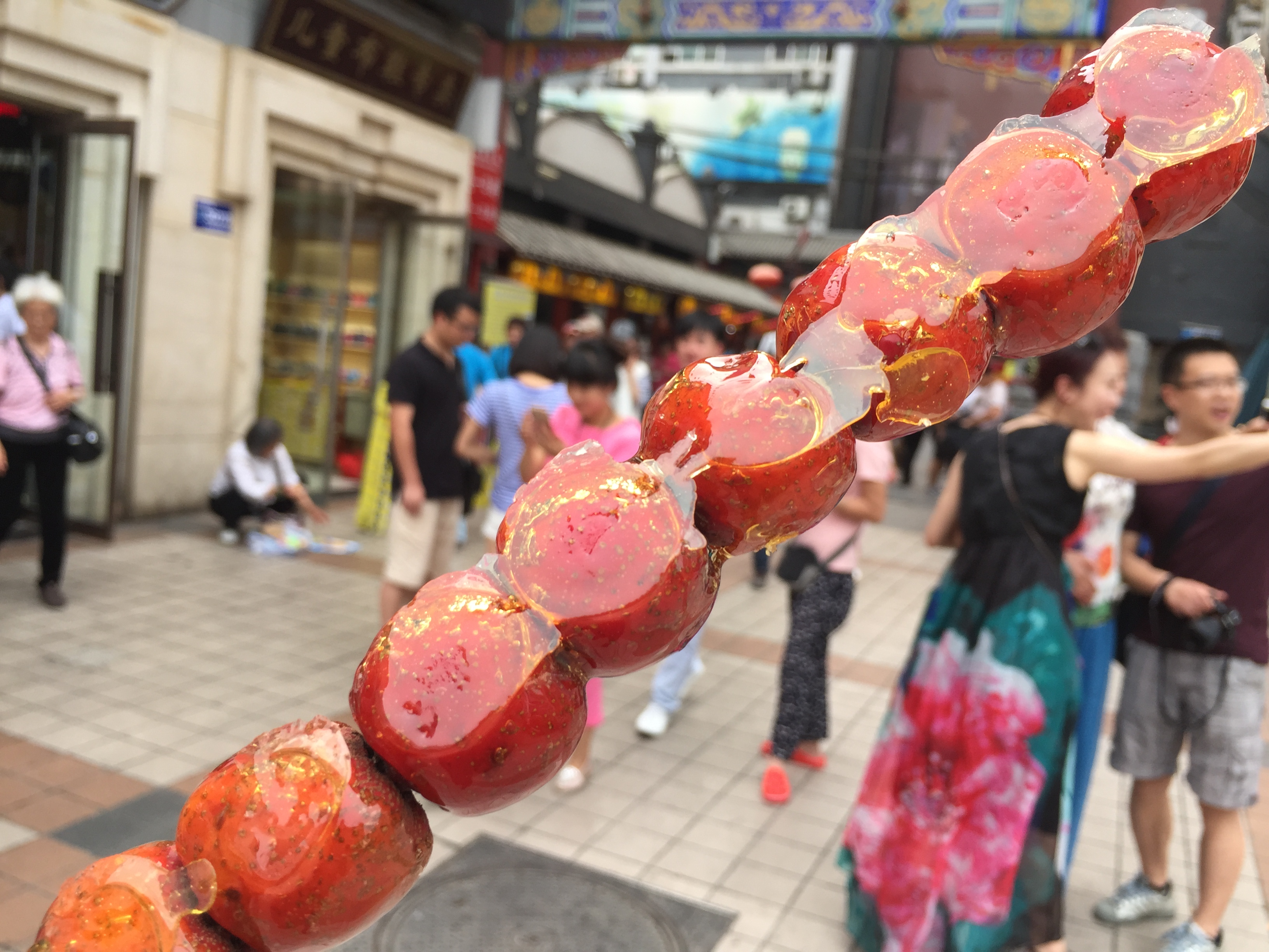 Let me get this out of the way now. No. I did not eat the scorpions on a stick. I did eat a fried pancake filled with sliced duck meat which fantastic, fried dumplings that looked good but were decidedly mediocre, and candied hawthorn berries on a stick. I regret eating the dumplings and not having room for the stinky tofu, which was being fried to order in the alley. But that duck pancake made up for a lot.