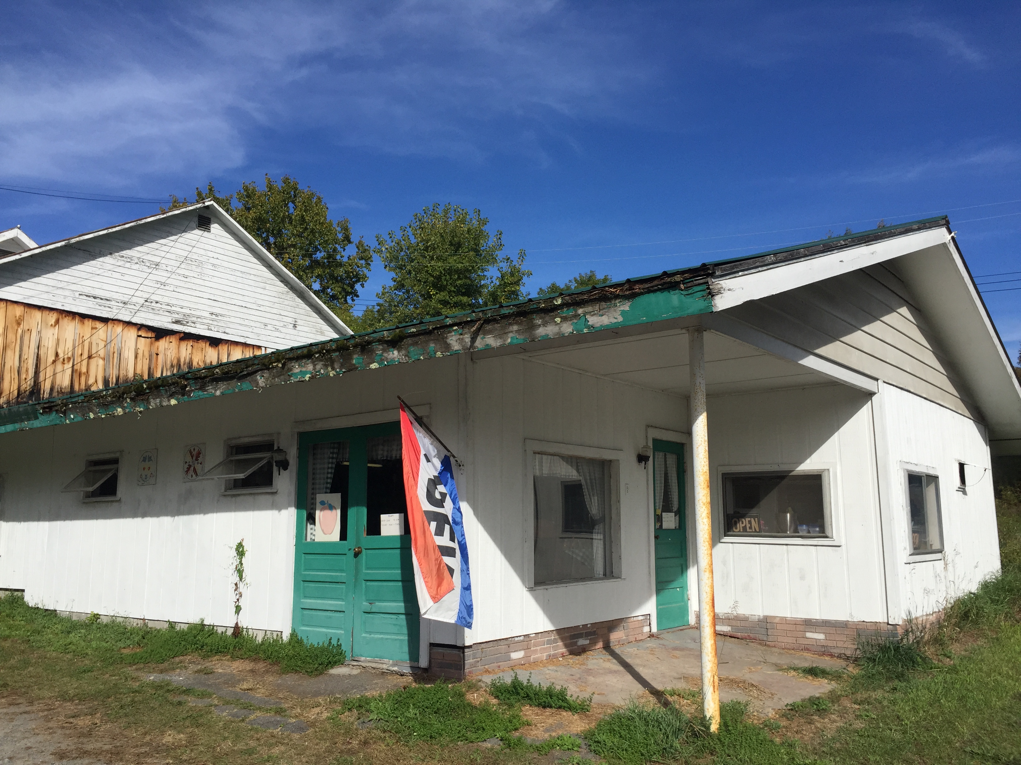 This place is hard to find, since beside the open flag dangling from a pole on the corner of the white shed, there is nothing to indicate the presence of a beloved local orchard. But pulling open the green door, it was clear we were in the right place. It’s a mom and pop operation filled with homemade baked goods, and pop behind the counter manning the donut robot. The smell was intoxicating.