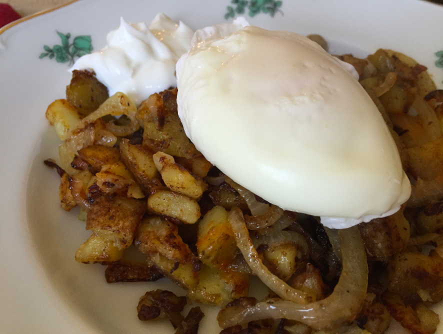 Lunch was one medium potato, one medium onion, one tablespoon of olive oil, one poached egg, and one tablespoon of low fat Greek yogurt. There was plenty of tabasco, and it was actually quite delicious.
