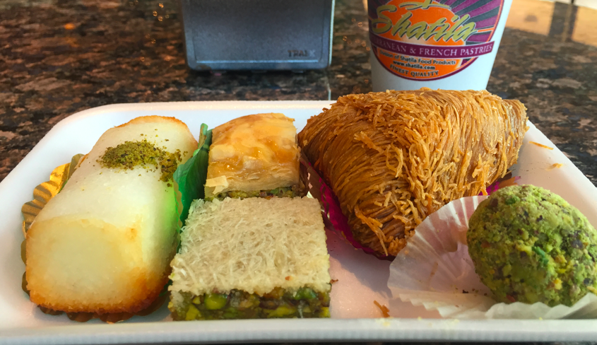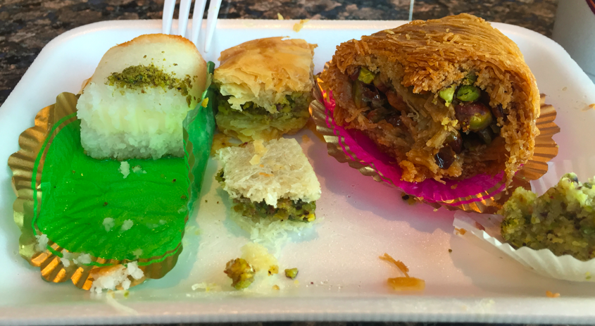 So I took an Uber to a Middle Eastern bakery, and it was magnificent. I knew nothing about the sweets I was selecting. But I was trying for a variety of textures and flavors. There were so many varieties of nutty, sweet, and aromatic treats, it was mind boggling. I thought I’d get a plate of six small bites. I did pretty well. Perhaps my favorite was the coconut log that seemed to be filled with a rosewater custard.