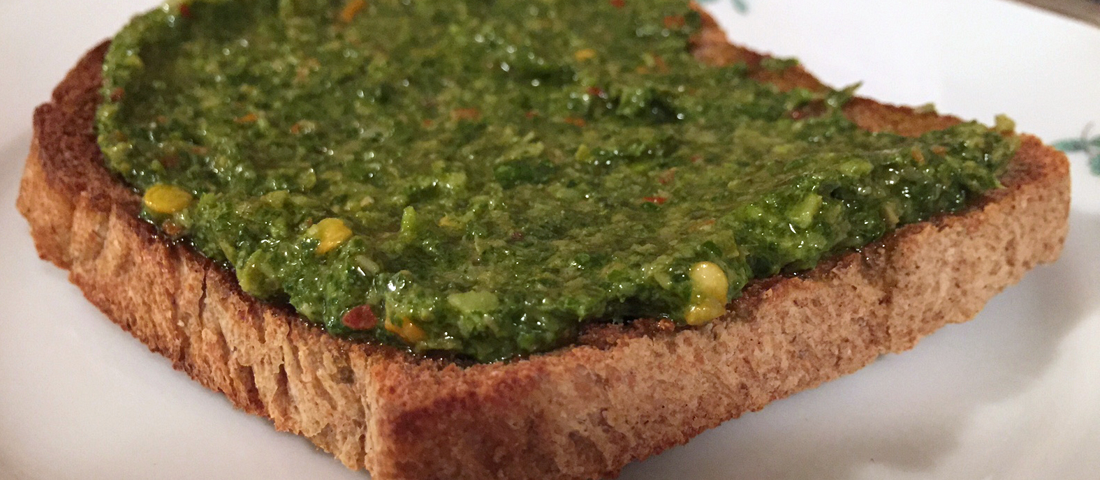 Maybe there’s a little salt in there too. But that’s the build. It all gets whirled up into a paste. And then it gets spread over everything. It’s great with poached salmon, or grilled meats. But as it turns out, this sauce is also fantastic on toast.