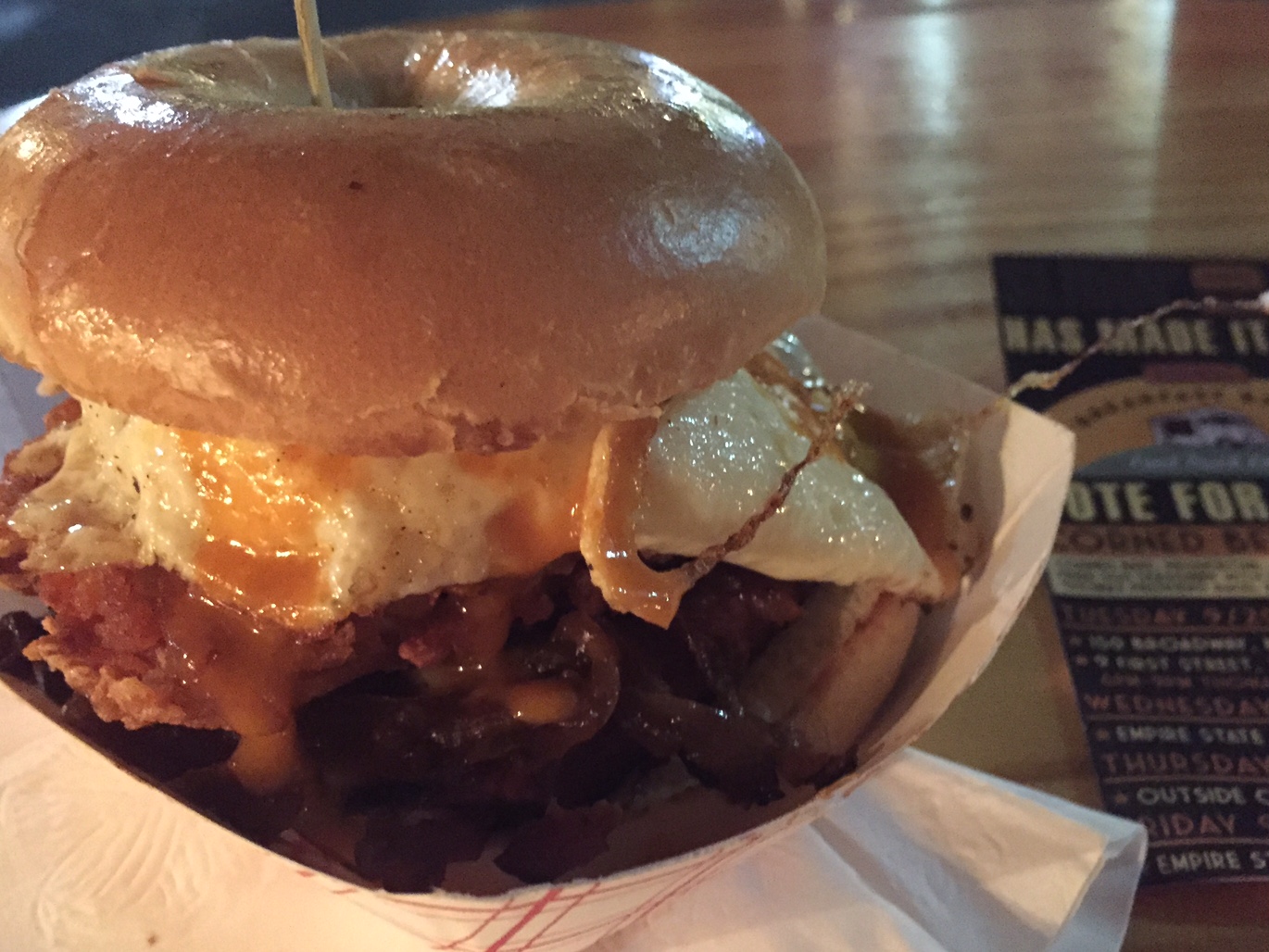 It looked great, so I went to Troy last night to give it a taste, and it was delicious. I think it would be even better on one of Slidin’ Dirty’s signature rolls instead of a Thomas mini bagel, but this competition is all about Thomas, so I get it.