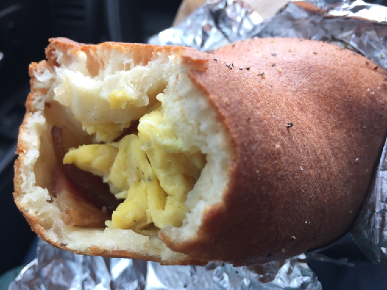 The bacon, egg, and cheese doughnut pocket sandwich from Nibble.
