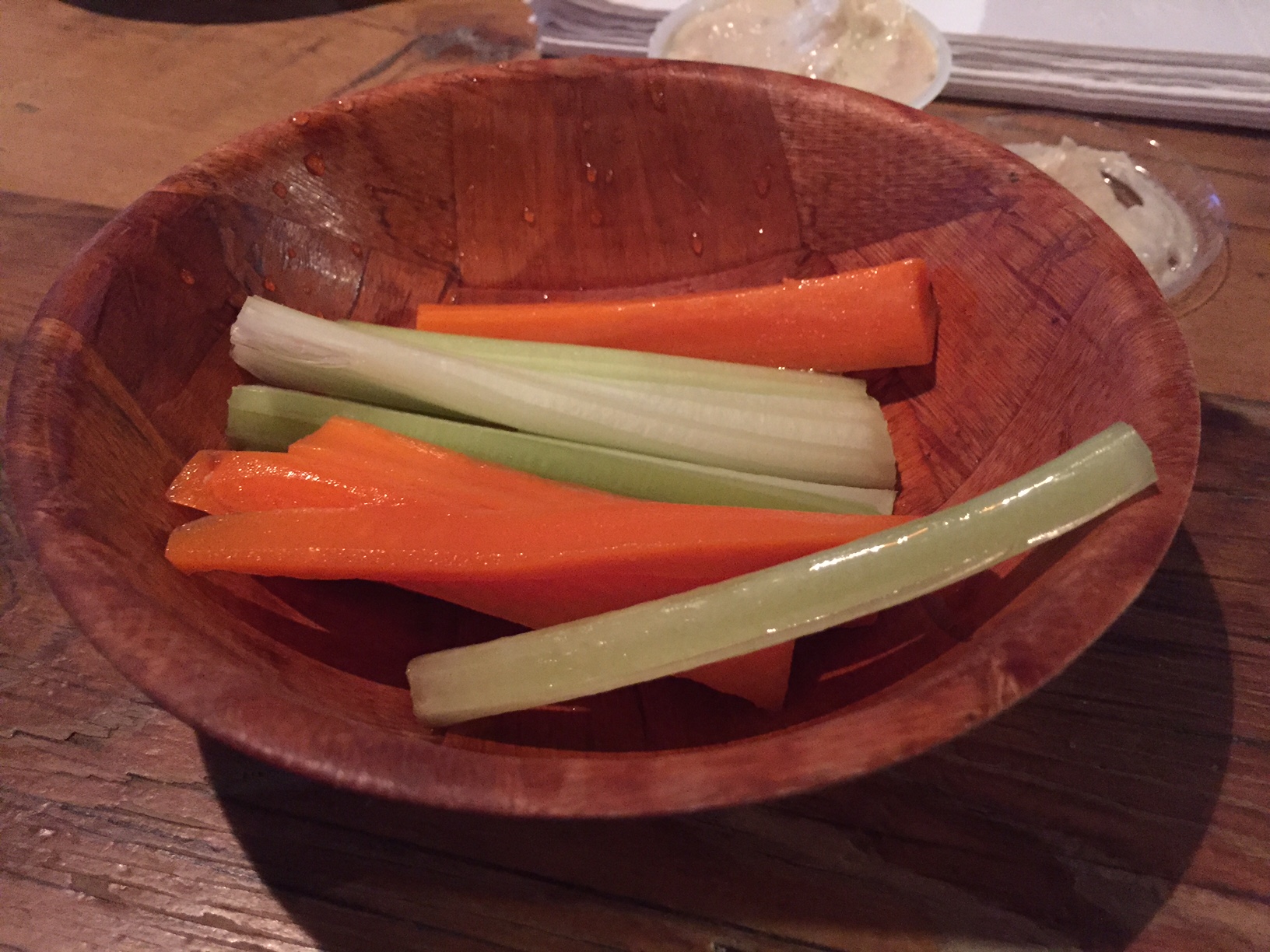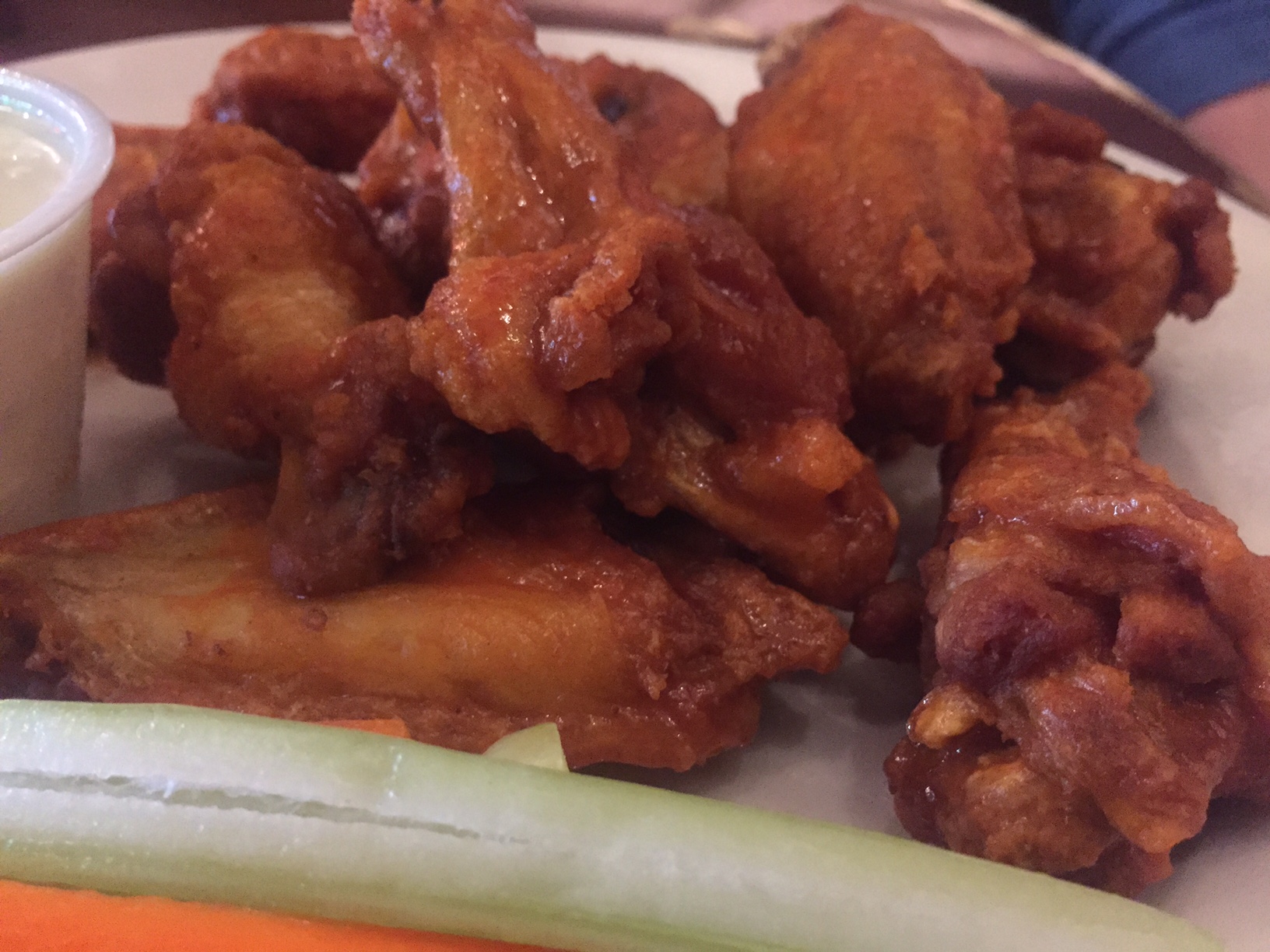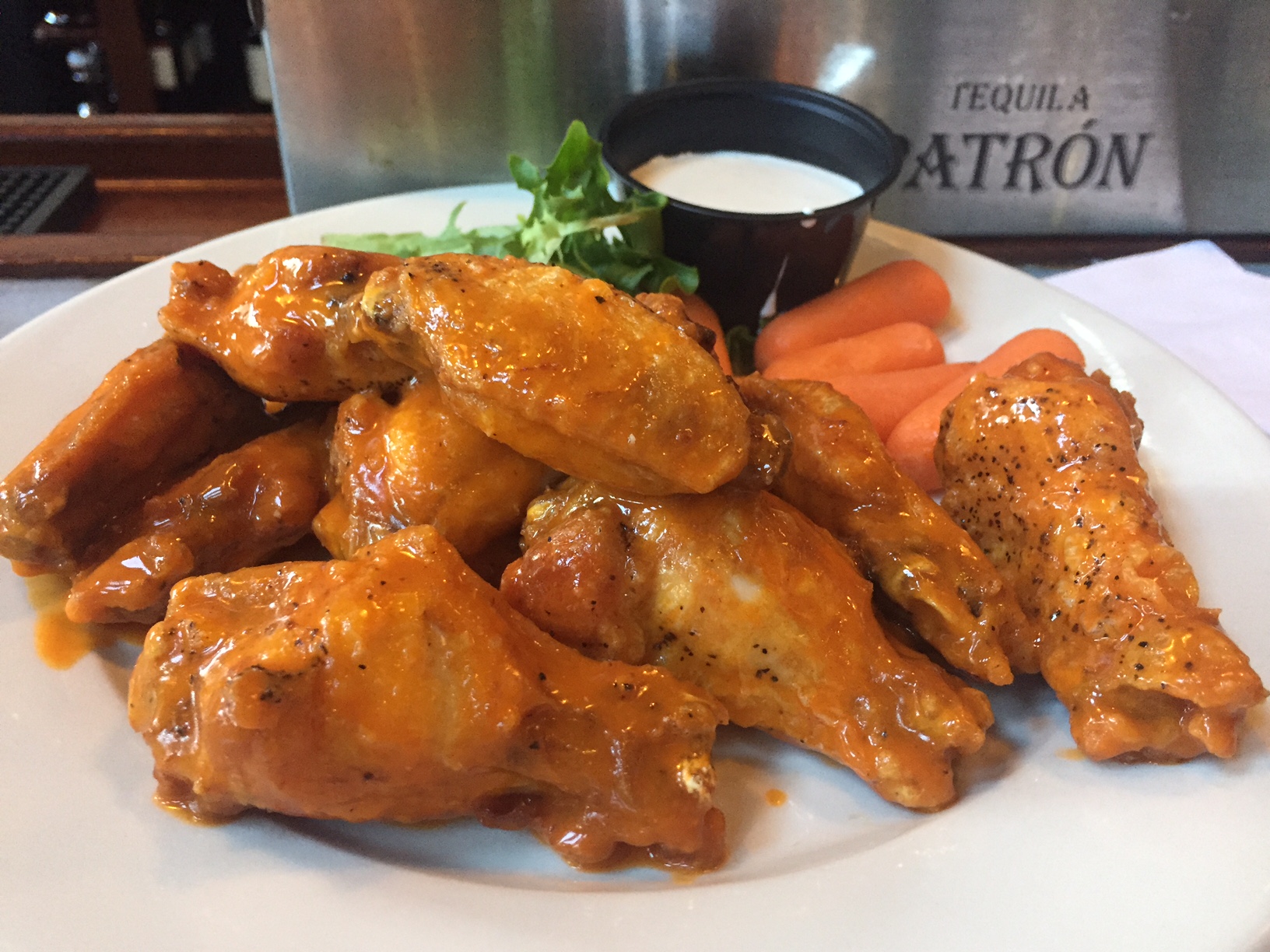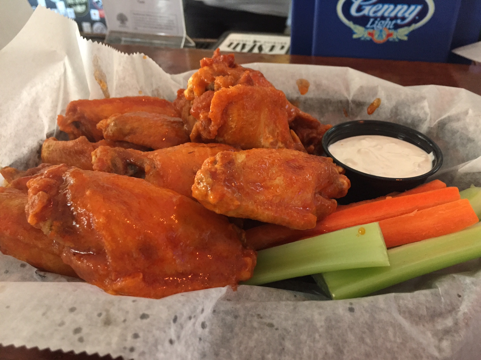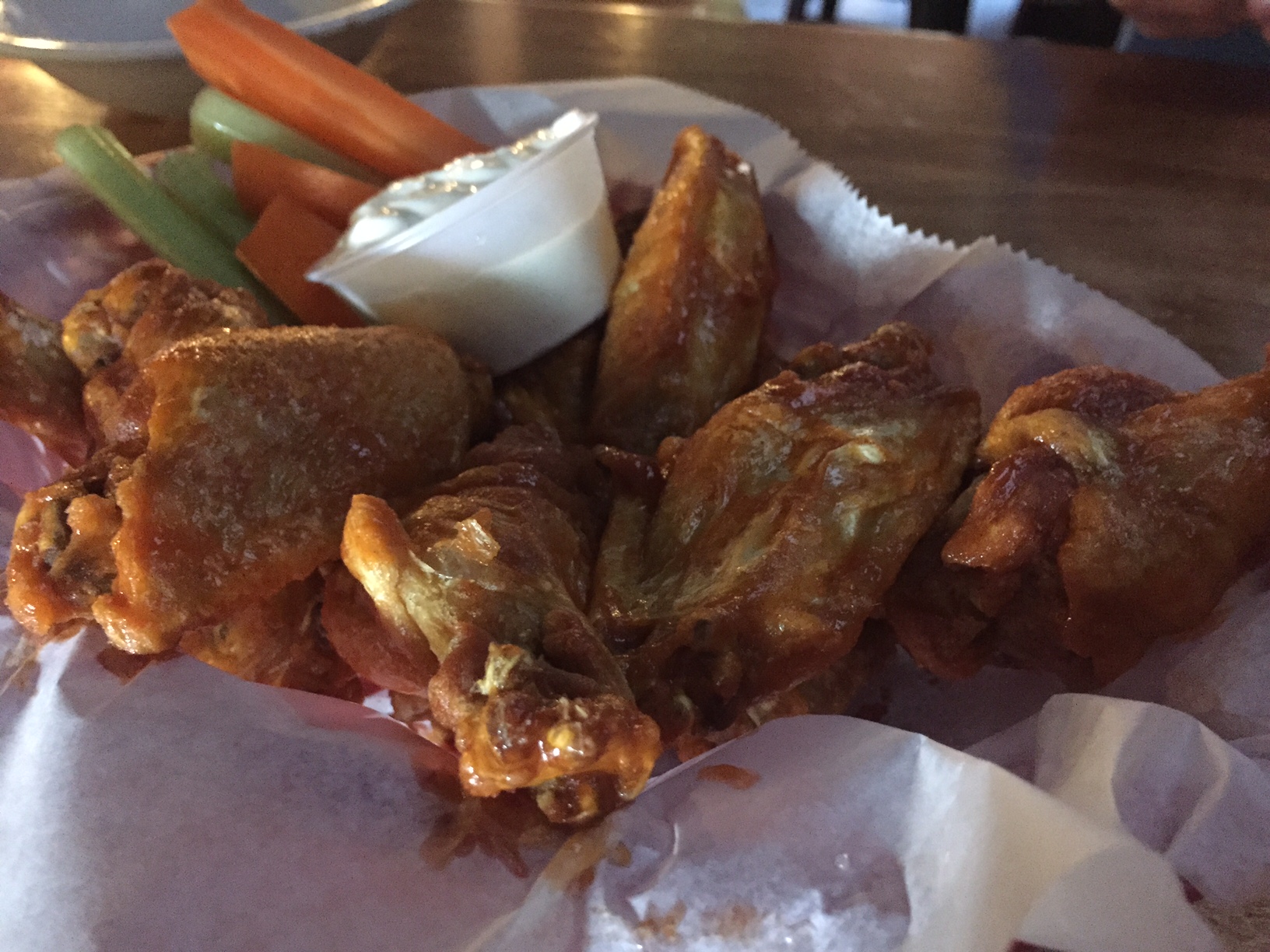 But wings aren’t just about wings. They are about ritual. And that ritual includes vegetables and blue cheese. The vegetables are celery and carrot sticks. But not here. Here it was baby carrots from a bag, and some wilting lettuce. This, along with the thinner buttermilk blue, felt like an afterthought on an $11 order of ten wings.