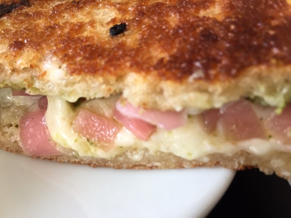 The Montague at Mab’s Kitchen in Troy. That’s smoked cheddar, homemade rosemary basil pesto, and red pickled onions.