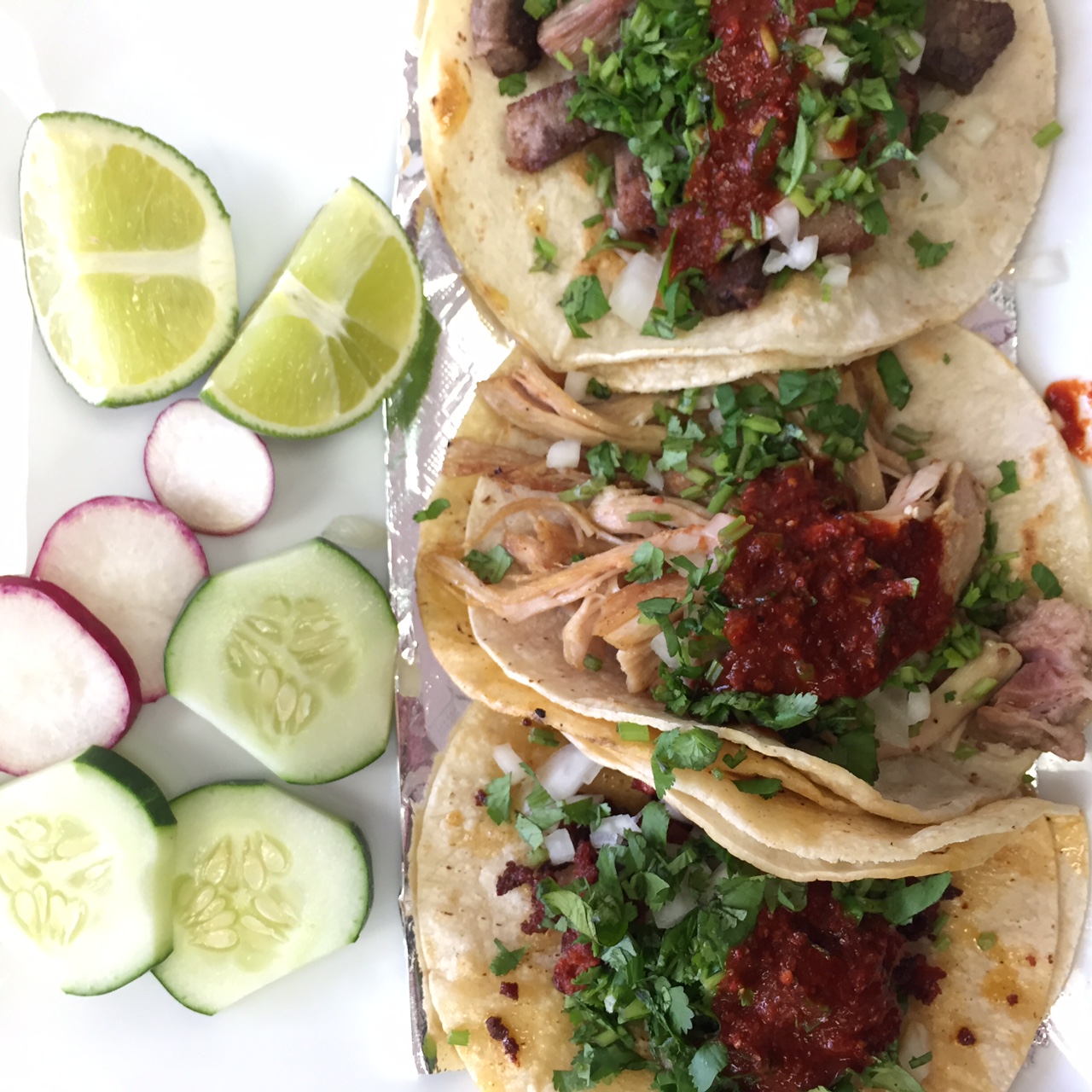 Tres tacos at Cocina Vasquez in Albany with great lighting. From the top down it’s steak, chicken, and chorizo.