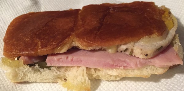 Amazingly, my Mother-in-law had all the ingredients in the refrigerator and already sliced. Roast pork, smoked ham, swiss cheese, yellow mustard, and pickles. In the absence of a sandwich press, I simply pushed the thing down by hand in a skillet with a little oil to coat the bottom.