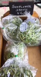 Chefs in the competition had limited prep space and equipment. They had water, but washing dirty greens wasn’t going to happen in their 30 minutes of cooking. Fortunately we found the above bags of sunflower shoots from Lovin’ Mama Farm. We may have chosen a different tender green, but the supply was a bit picked over, and this was the one remaining where we could get three bags of identical greens. The fennel was also looking lovely, so we picked up three of those, and for good measure picked up some shallots too.