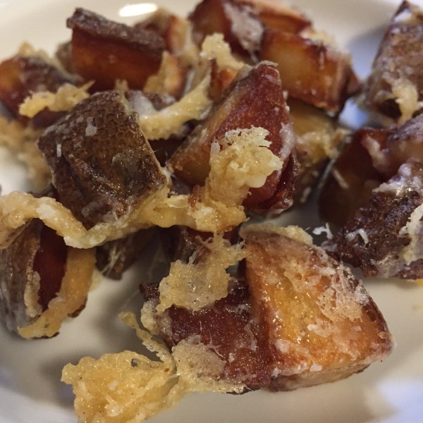 Parm-Reg crusted potatoes. Mrs. Fussy stored a cheese grater with its hopper loaded with just a bit of cheese in the fridge. I had to empty the fridge to make room for more pork shoulders. So, I did the obvious thing. Took a leftover potato, fried it in olive oil, and then grated the cheese into the hot pan over the crisped spuds. Man, this was good.