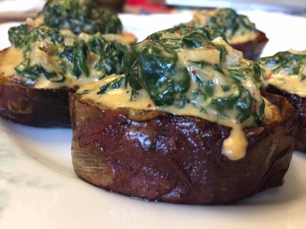 I had baked those potatoes the day before, using my favorite method. Then took a cold one from the fridge and sliced it into rounds. Those rounds went into a cast iron skillet with a little safflower oil, to sear both sides. Then they were topped with the piquant creamy, cheesey spinach.