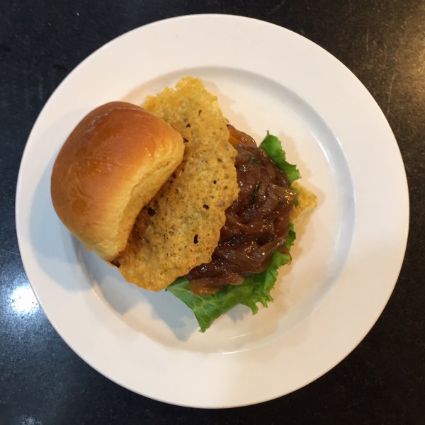 The build of my french onion veal sliders was pretty simple: bun, a dijon and mayo spread, a leaf of lettuce, the patty, the onions, and a crisped cracker made from gruyere cheese. Those were fun to make, even if mine came out extra large. Listen. Nobody complains about too much crispy cheese.