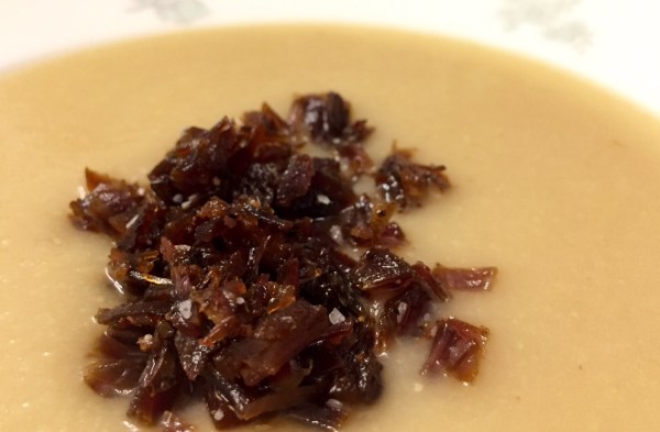 Beef confit? There were some leftover fatty bits from the prime rib roast that my father-in-law made. Remember, we don’t waste things around here. So I rendered out the fat, and scooped out the meaty shreds that remained. They made a great garnish on a winter soup of celery root, white beans, and potato.