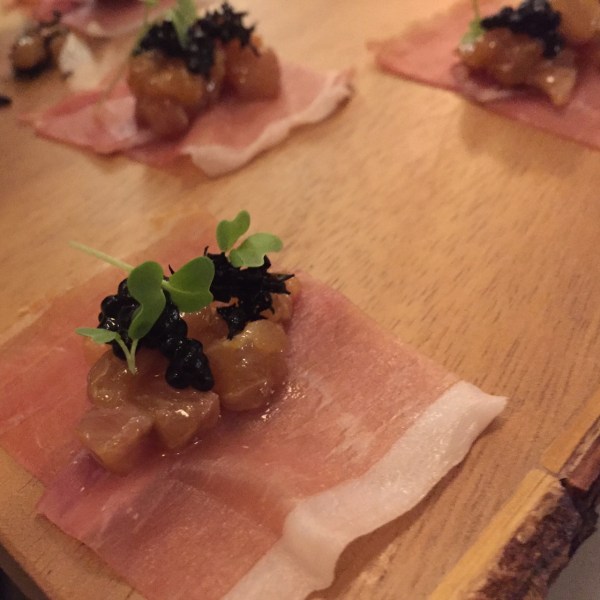 Was it mere chance that the grain of the jamon serrano lined up with the grain of the wood serving tray? I don’t think so. Regardless, this delicate canape of pork, fish, and truffle was a delightful first bite from chef Brad Kilgore.