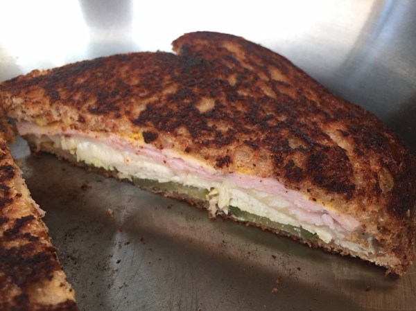 This is not a Cuban sandwich. It’s not on Cuban bread. It’s not even a medianoche, which you can make on a potato roll. But it is a grilled cheese sandwich inspired by the Cubano. So it has swiss cheese, a slice of ham, a slice of roast pork, a few pickles, and a shmear of yellow mustard. There’s no reason to overthink this, load it up with more meat, or tinker with the perfect balance of textures and flavors.