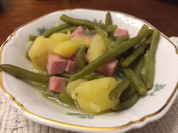 In Pennsylvania they make a dish out of ham, string beans, and potatoes. They are simmered in ham stock, and the green beans are simmered until they become totally soft. It sounded totally unappealing to me until I tried it, and found that this is surprisingly delicious.