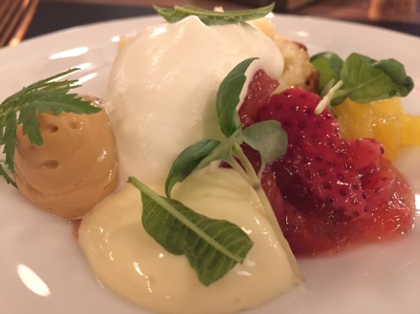 It was either this week or the last that I was berating someone about looking to buy strawberries in January. Well, my apologies. It turns out they are totally in season right now in Miami, and chef Brad Kilgore brought some up with him to the Rascal + Thorn dinner. More on this dish later, but let me tell you how nice it was to have a bright taste of summer on a freezing January night in Saratoga Springs.