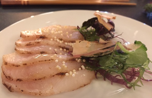 Kilgore brought some cobia up from Miami. He told us a bit about the fish, how it’s caught, and a bit on its unique texture. It has a little crunch when you bit into it. Again, calling this just sashimi doesn’t quite give enough credit to all the work that went into its composition.