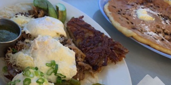 This opened up a discussion between us. My aunt ordered the traditional eggs benedict. As she explained her food philosophy, “If if I am at a restaurant for the first time, I get something I have had before. This is the best way to compare restaurants through the same dish. If I go back, I get something else.” My uncle went for the corned beef hash. As he explained, “I open up a menu, decide what looks good, and go for it. I rarely go in knowing what I want.” No research, no substitutions, just gut instinct. My mom also went with the cobb, but as she explained,”I got salad because I like salad and I wanted something healthy. And then I put blue cheese and bacon on it.” The boyfriend went with one of the specials of the day, duck tostadas in addition to a giant chocolate chip pancake, pointing out, “specials are fresh and you usually can’t get them any other time. I would rather have a special dish to remember; I’m always a sucker for a special even if it is not what I want. I only look at pictures, I rarely look at reviews online.”