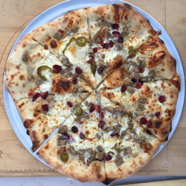 He also made this delightful number inspired by a contributor to the pizza forums. It has sausage, hot peppers, rum soaked cranberries, and is topped with a drizzle of hot honey. It’s memorable combination of sweet, heat, and meat.