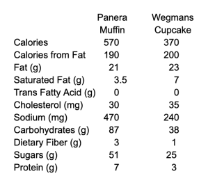 When I found out, I simply asked her if she had the choice between a Panera pumpkin muffin and a cupcake, which one would she choose. I told her that I was pretty sure nutritionally, they were about equivalent. And her love for sweets put her squarely on #TeamCupcake however, Mrs. Fussy thought I was making up facts to support my theories. So below, I present a full cross comparison between the Panera pumpkin muffin and Wegmans yellow cupcake with chocolate buttercereme.