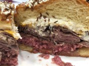 Burger #2 came from Ale ‘n’ Angus Pub in Syracuse which won the contest last year. This time around they made a Beef on Weck burger using a kimmelweck roll and topping a ground beef patty with sliced roast beef, cheese, and horseradish sauce. And that was one tasty burger. The problem, as I saw it, was that the burger played second fiddle to the roll. The roll was the star of this show, and it brought along a supporting cast of beefy extras.
